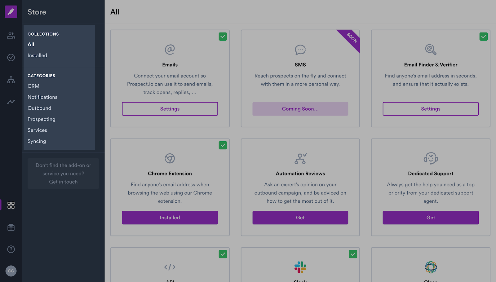 La boutique contient différents types d'applications : intégrations CRM, modules externes sortants (e-mails, SMS), applications de notifications, modules complémentaires de prospection (Email Finder & Verifier, Extension), etc.